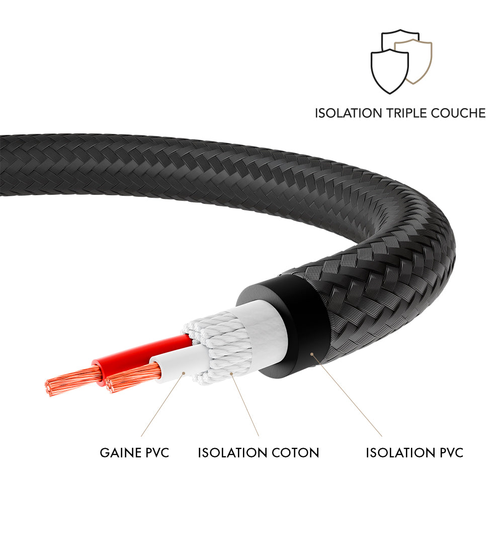 • Une gaine externe en textile tressé et PVC, à la fois souple et résistante, qui protège le câble des interférences.
